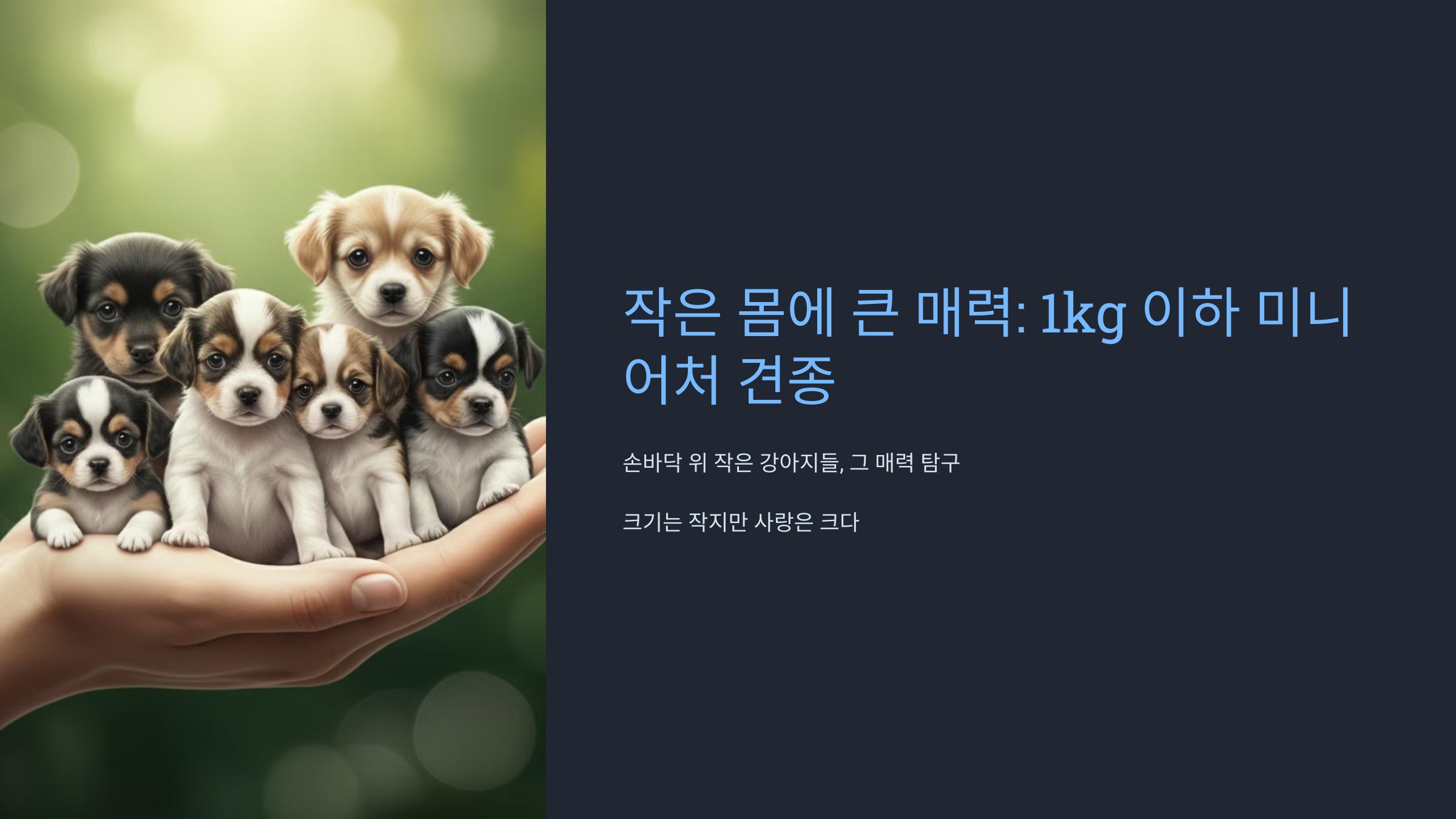 여러분, 손바닥 위에 올려놓을 수 있을 만큼 작은 강아지를 상상해보신 적 있나요? 오늘은 그런 초소형 견종들, 특히 체중이 1kg 이하인 미니어처 견종들에 대해 알아보려고 합니다. 이 작은 친구들은 크기는 작지만, 그 매력만큼은 어떤 대형견 못지않답니다. 함께 이 작고 귀여운 세계로 들어가 볼까요?