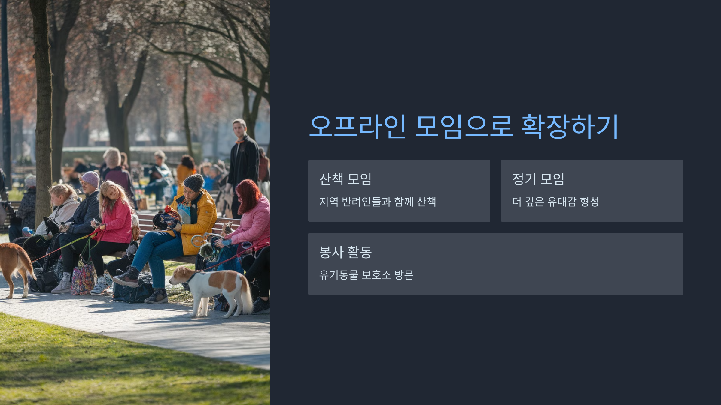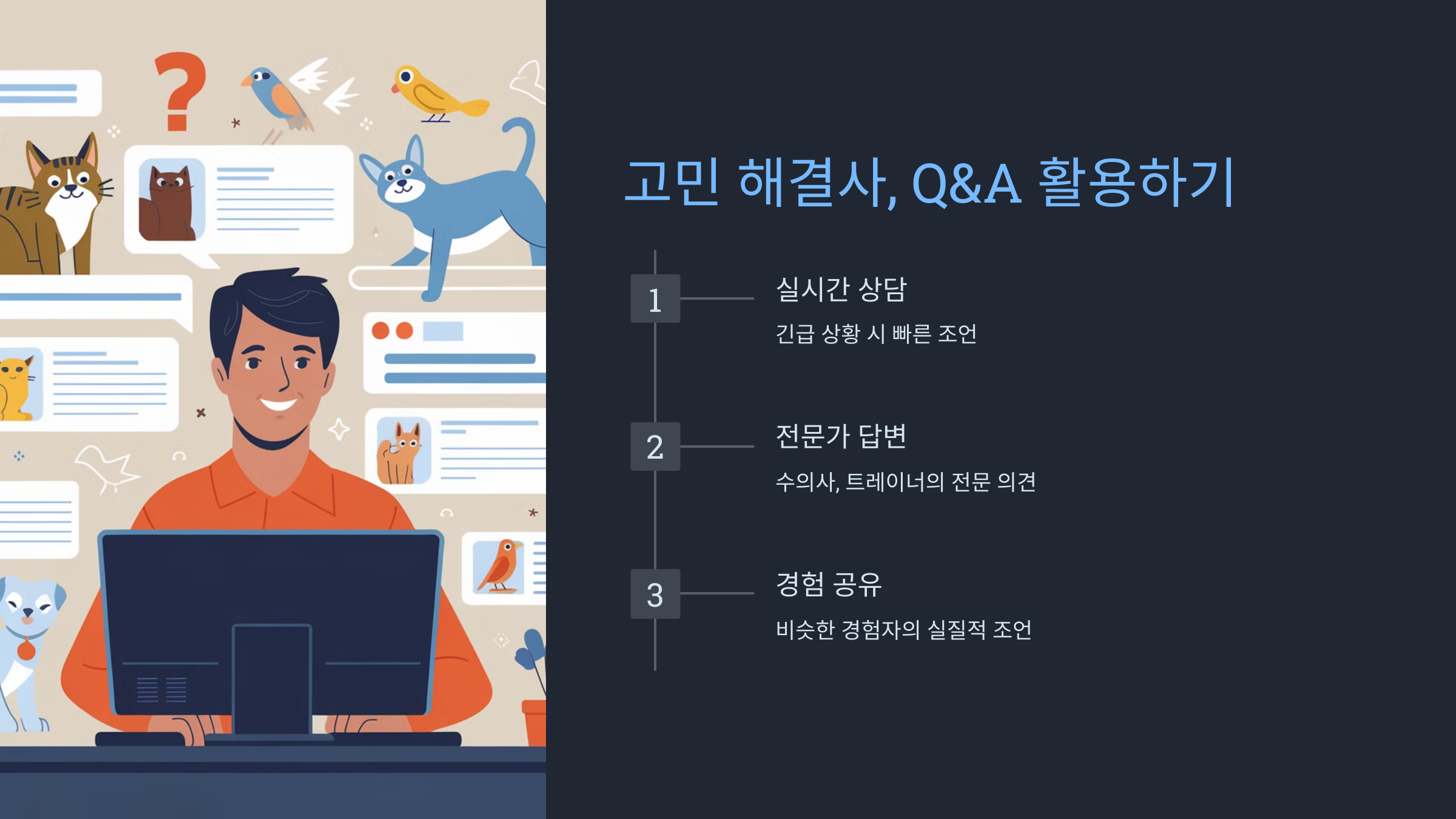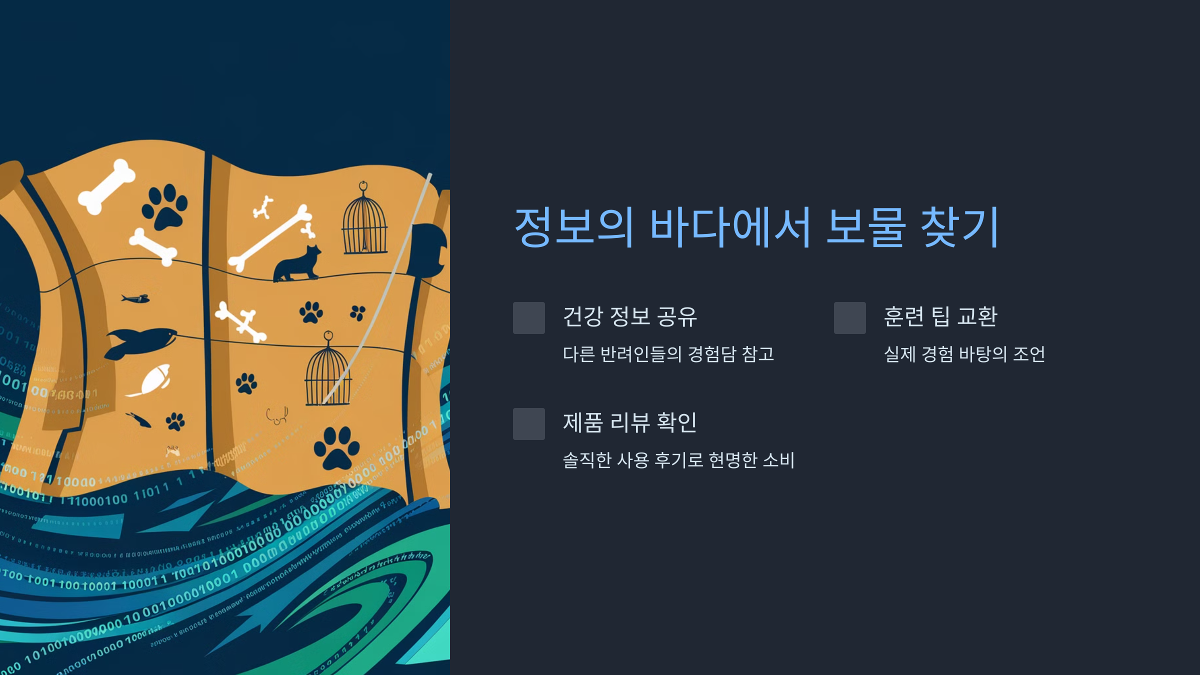 - 경험 공유: 비슷한 경험을 한 다른 반려인들의 조언을 들을 수 있어 실질적인 도움을 받을 수 있습니다.