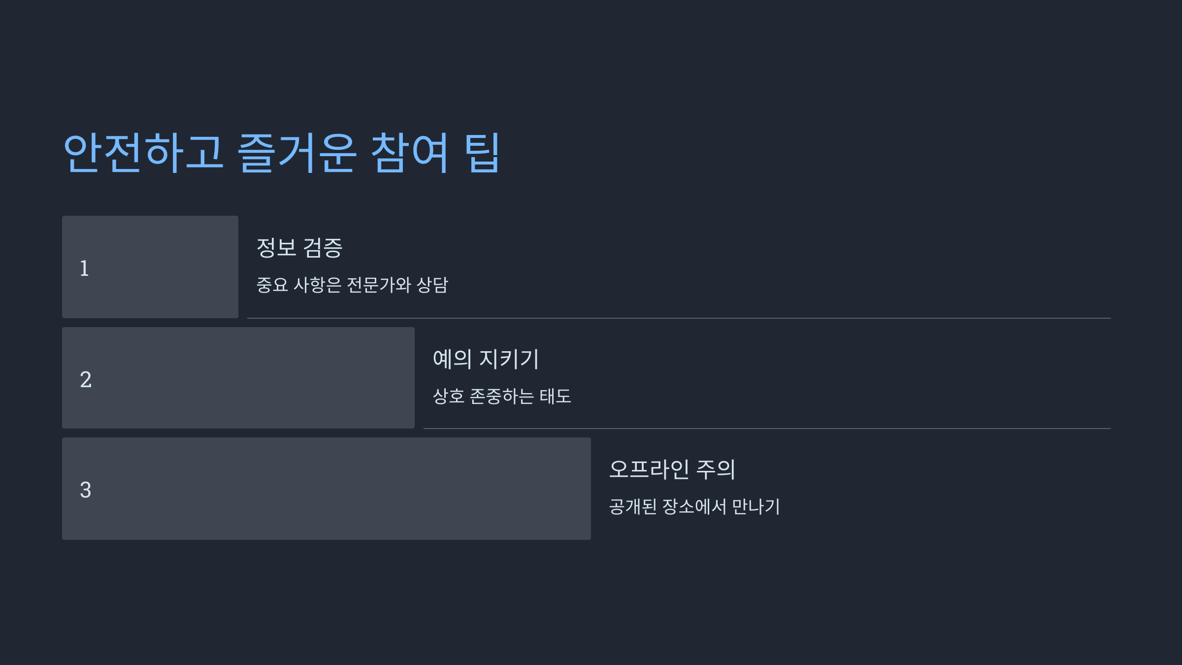 A: 먼저 다른 사람들의 게시물을 읽어보며 분위기를 파악하세요. 그리고 간단한 자기소개나 반려동물 사진으로 첫 게시물을 올려보는 것도 좋아요. - Q: 오프라인 모임에 참여할 때 주의할 점이 있나요?