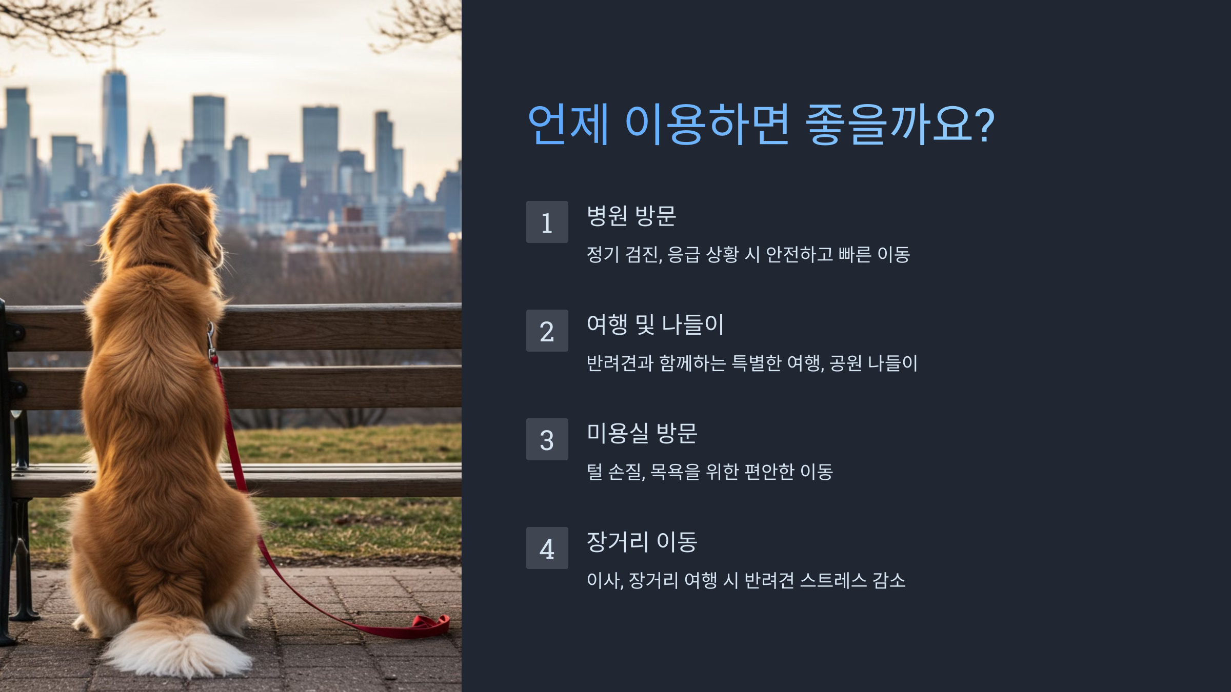 반려견 전용택시는 다양한 상황에서 유용하게 이용할 수 있어요: