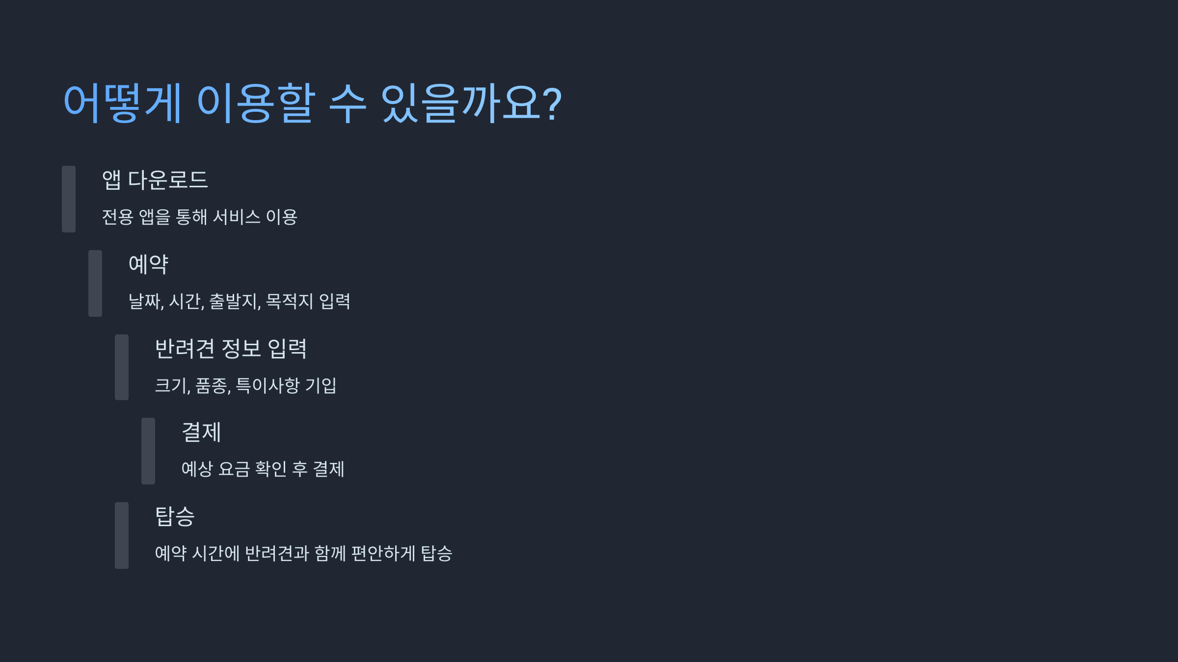 - 탑승: 예약한 시간에 반려견과 함께 편안하게 탑승하세요!