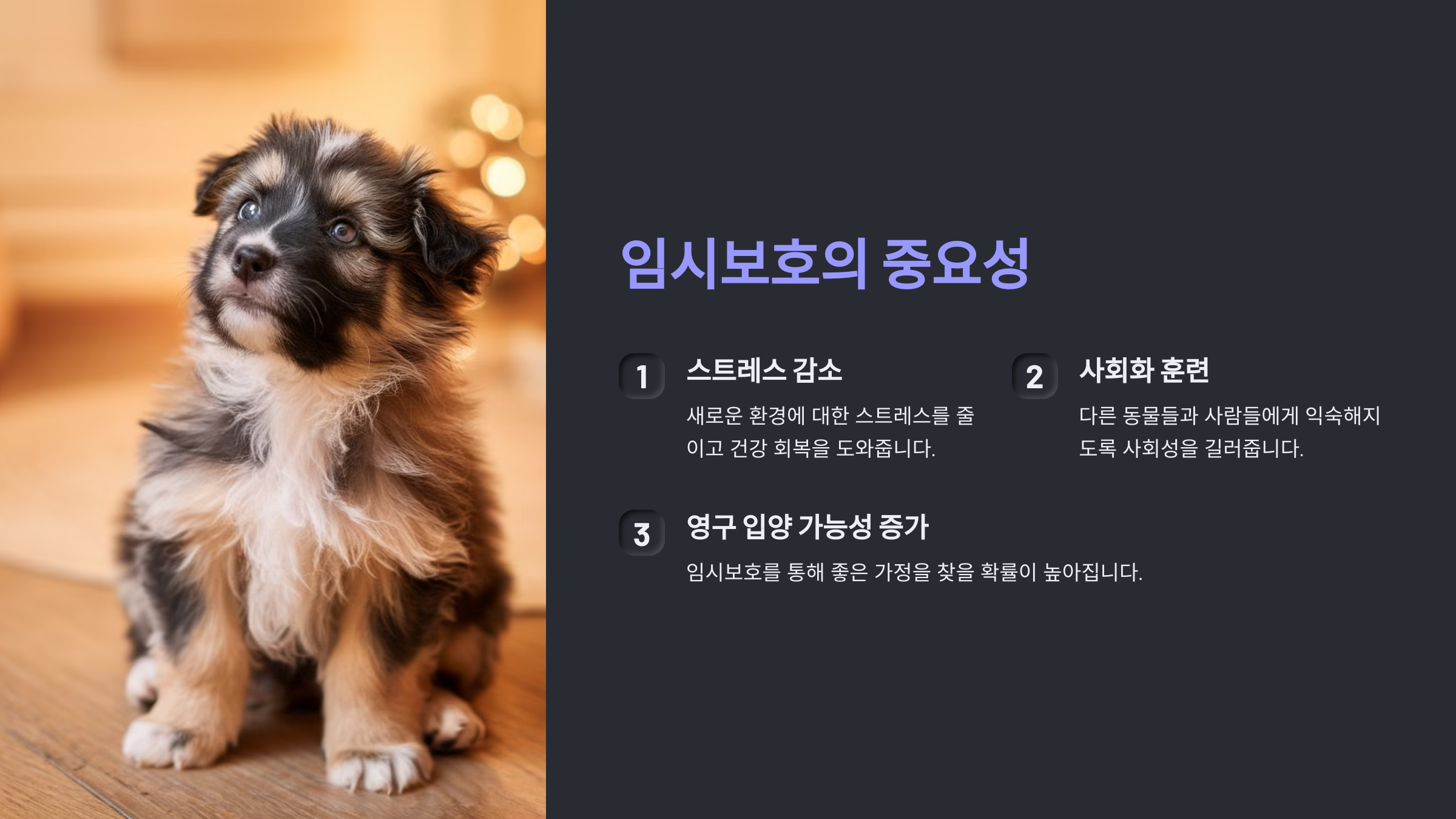 반려견 임시보호는 단순히 한 마리의 개를 돕는 것 이상의 의미를 가집니다. 이는 생명을 존중하고, 사회적 책임을 다하는 아름다운 실천입니다. 여러분의 작은 관심과 사랑이 한 생명에게는 세상을 바꾸는 큰 변화가 될 수 있습니다.