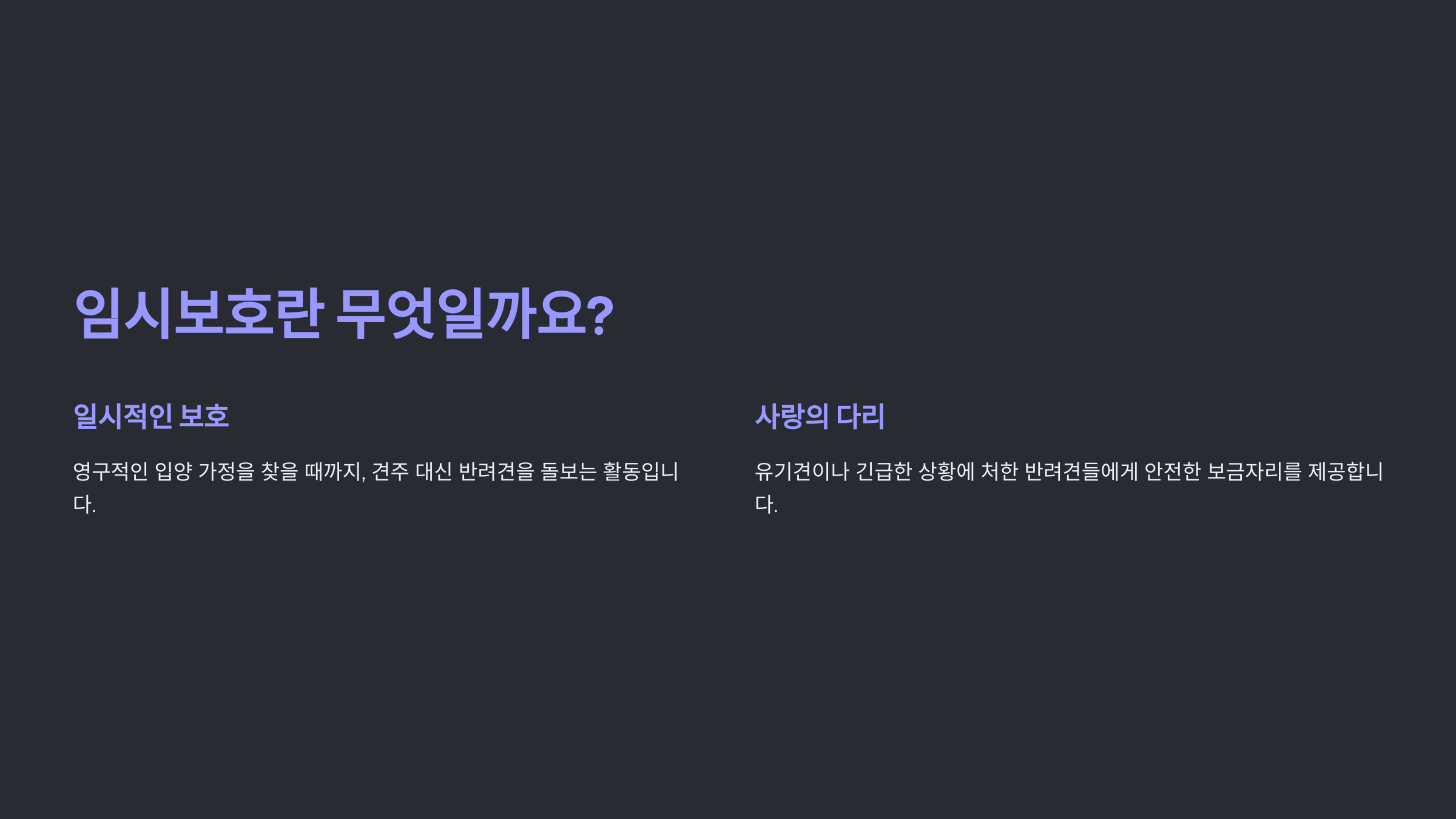 여러분의 따뜻한 마음이 한 생명에게 새로운 희망이 될 수 있습니다. 함께 만들어가는 사랑의 다리, 반려견 임시보호에 동참해보세요!