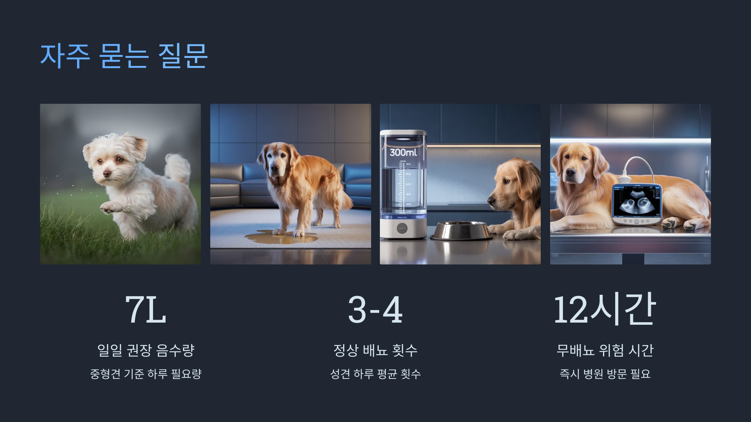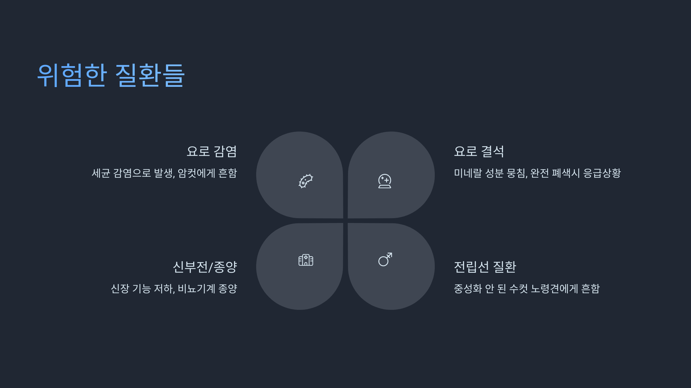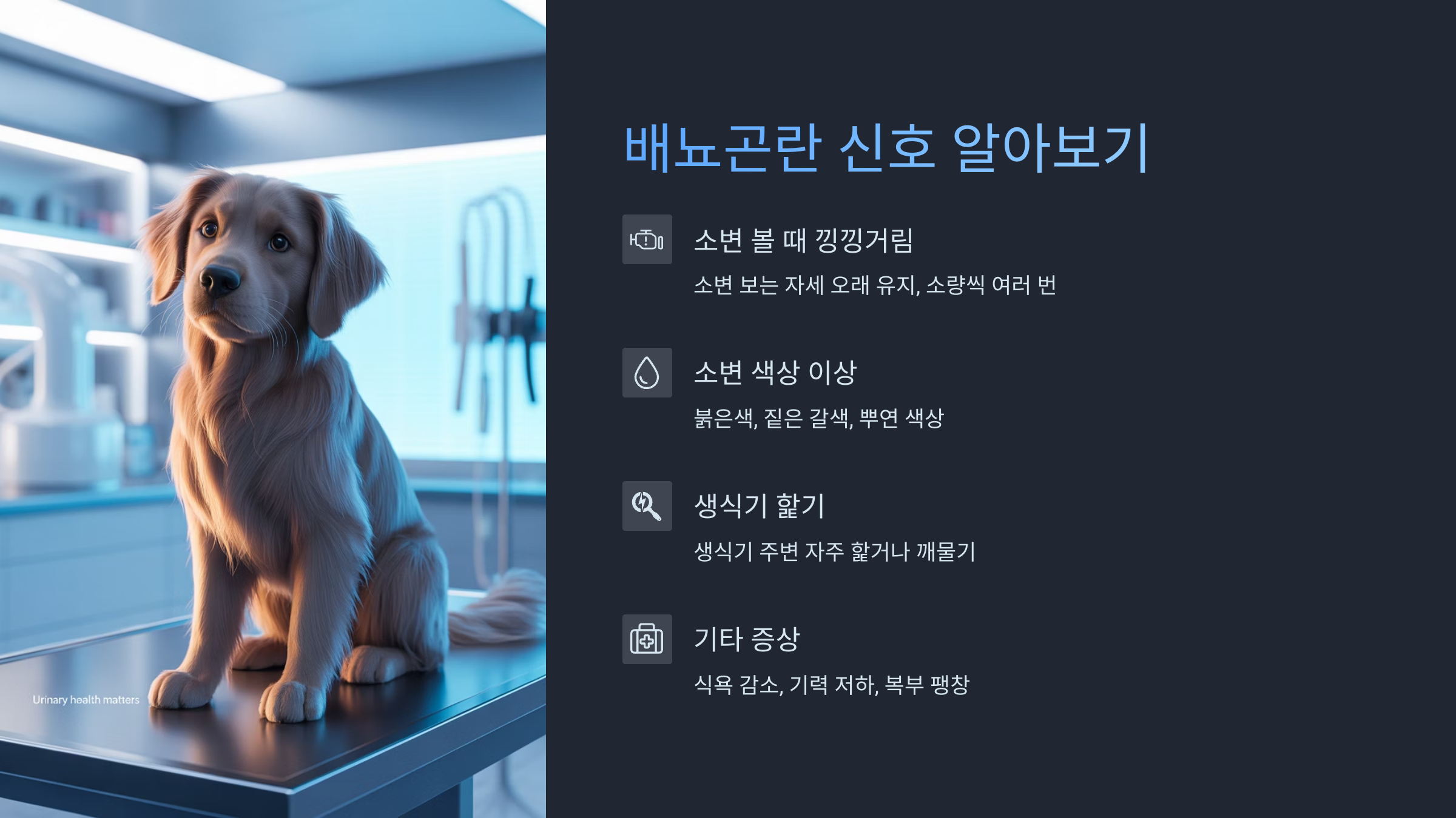 | 질병의 초기 신호 | 요로 결석 초기 증상 전립선 문제 초기 (수컷) 방광 기능 저하 (노령견) |