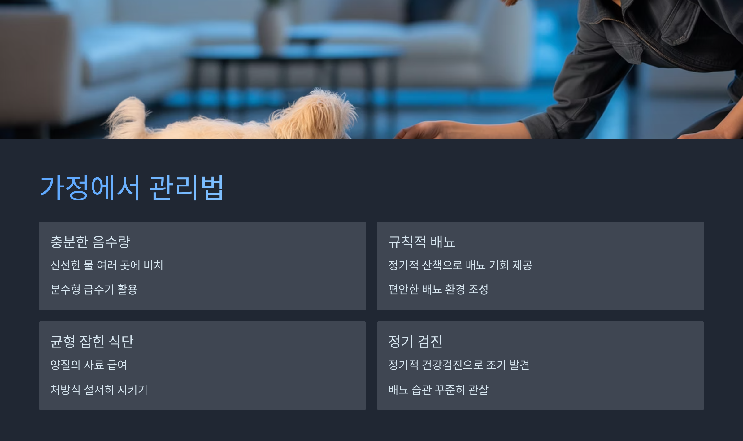 처방식 사료 급여 철저히, 충분한 음수량 공급, 정기적인 검진으로 재발 방지 |