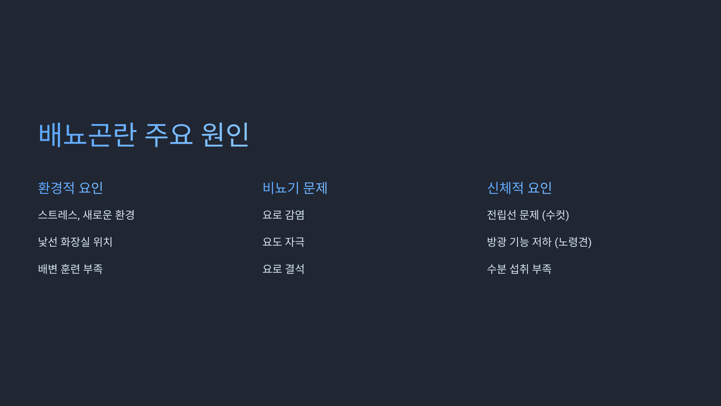 | 환경적/행동적 요인 | 스트레스 (이사, 새로운 가족 구성원 등) 배변 환경 변화 (화장실 위치 변경, 낯선 장소) 배변 훈련 부족 |