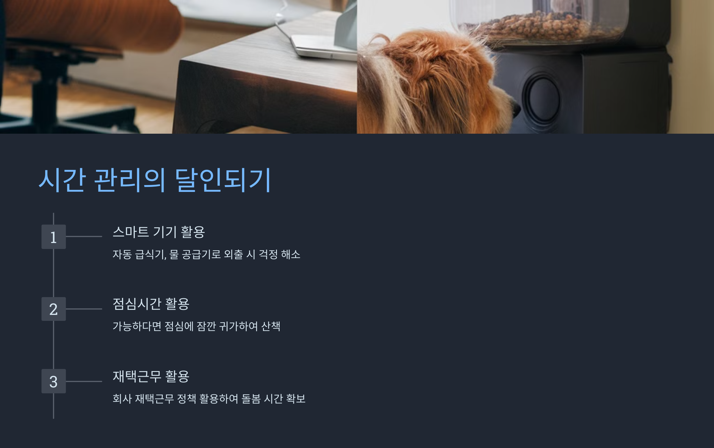 1인 가구의 가장 큰 고민은 바로 시간일 거예요. 직장 생활과 반려견 돌봄을 어떻게 병행할 수 있을까요?