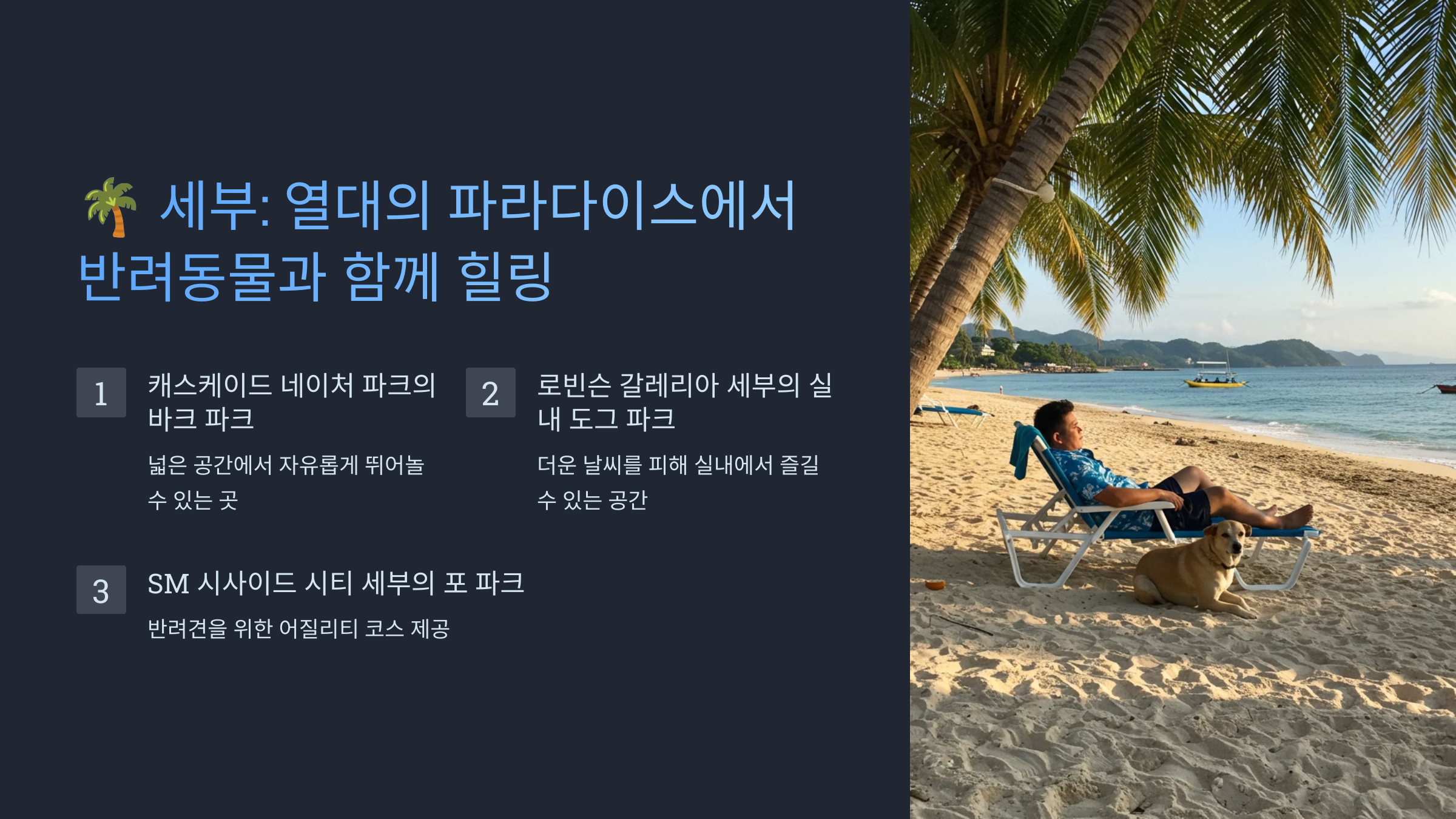 세부의 아름다운 해변과 함께 이런 특별한 공간들은 반려동물과의 여행을 더욱 특별하게 만들어줄 것입니다. 푸른 바다를 배경으로 반려견과 함께 찍는 인생샷, 기대되지 않나요?