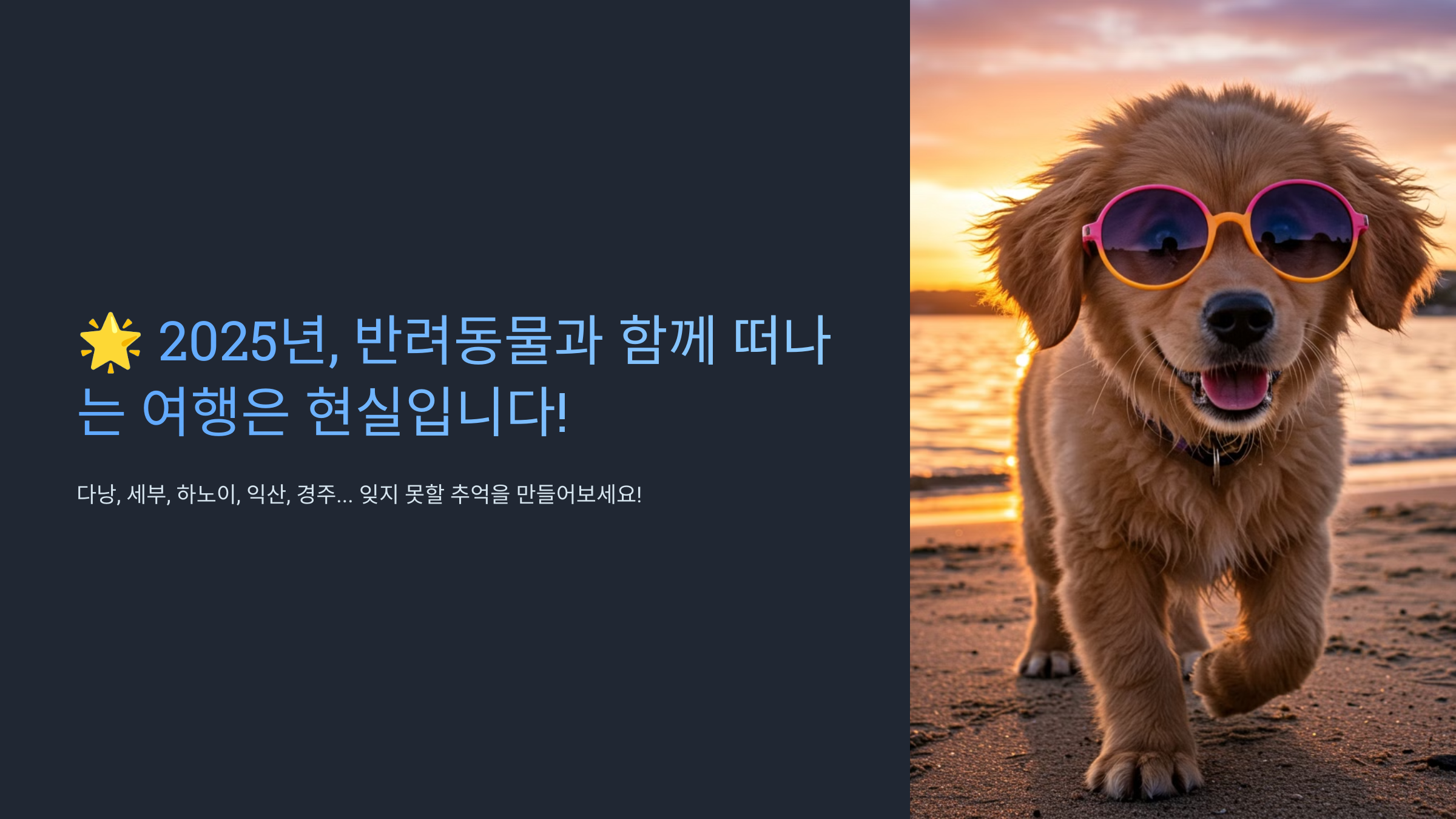 2025년, 반려동물과 함께하는 여행은 더 이상 꿈이 아닌 현실이 되었습니다. 다낭의 해변, 세부의 열대 풍경, 하노이의 역사적 거리, 그리고 한국의 익산과 경주까지. 이 모든 곳에서 여러분은 소중한 반려동물과 함께 잊지 못할 추억을 만들 수 있을 것입니다.