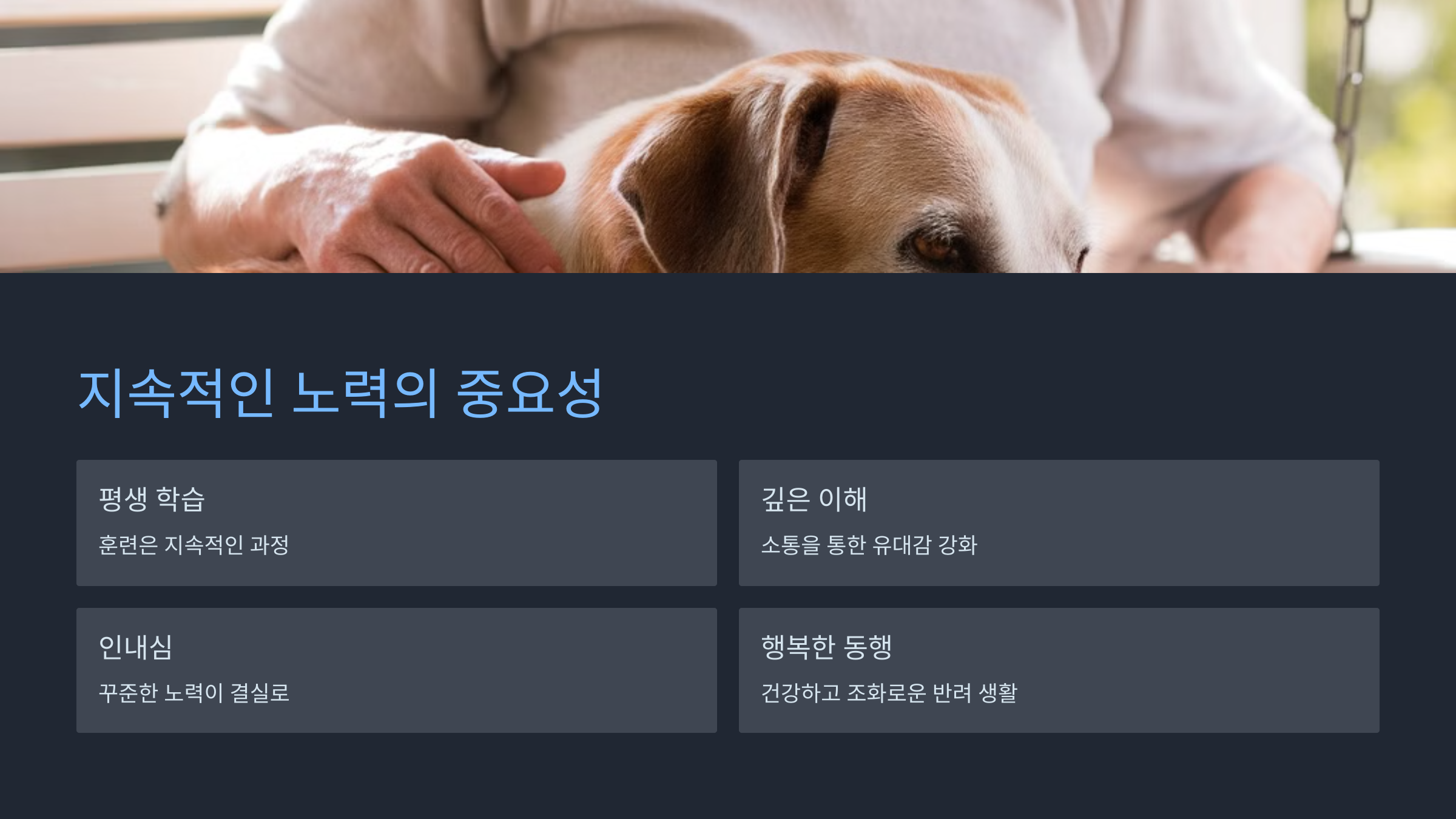 3주간의 집중 훈련을 통해 여러분의 반려견은 기본적인 명령어와 매너를 익혔을 것입니다. 하지만 이것이 끝이 아닙니다. 반려견과의 관계는 지속적인 소통과 이해를 바탕으로 발전합니다.
