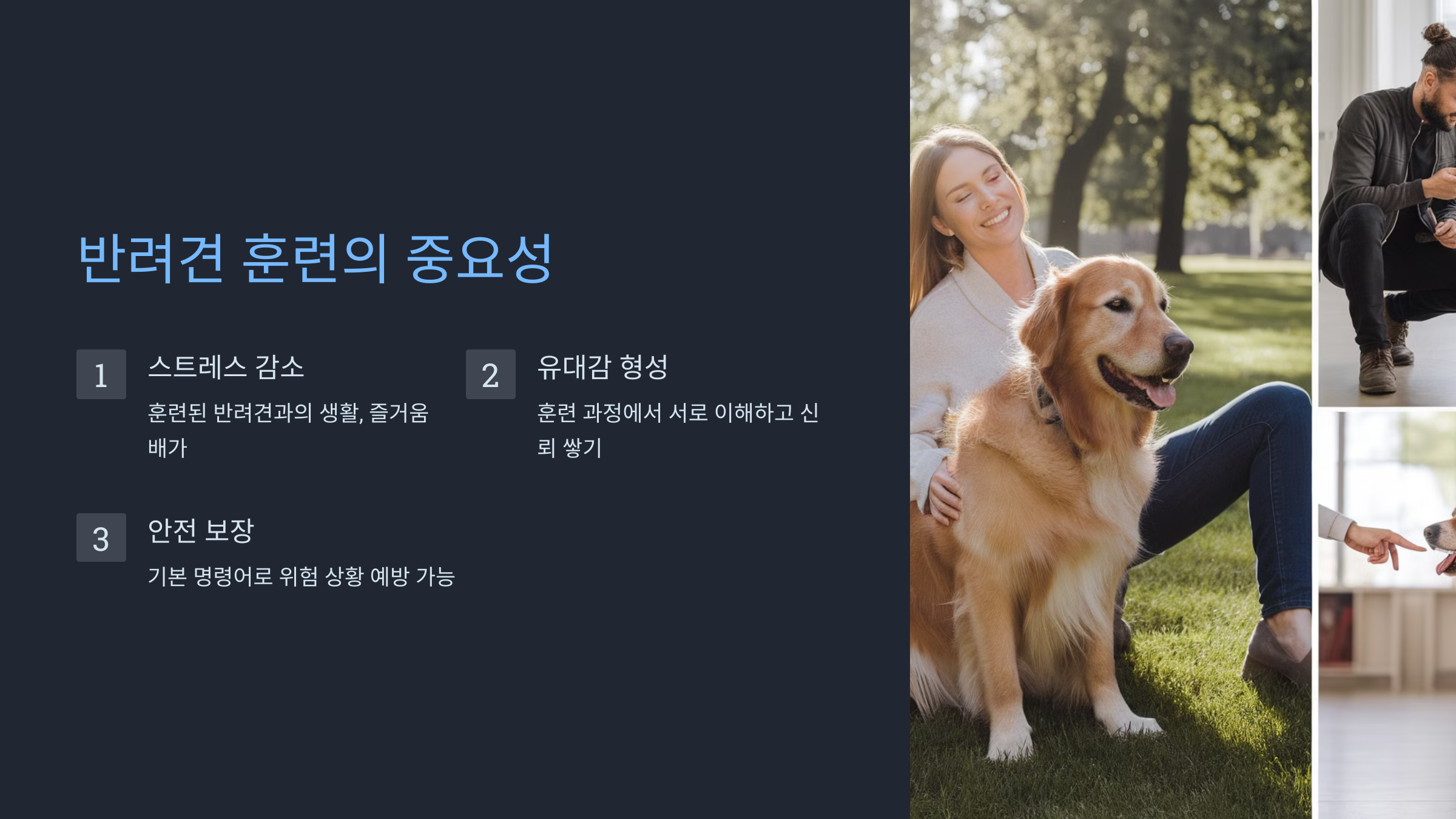 반려견을 키우는 즐거움은 말로 표현할 수 없을 정도로 큽니다. 하지만 때로는 예상치 못한 도전에 직면하기도 하죠. 특히 기초 훈련이 되지 않은 반려견과 생활하다 보면 스트레스가 쌓이기 마련입니다. 그래서 오늘은 여러분과 함께 '3주 완성! 반려견 기초 훈련 마스터하기'에 대해 이야기해보려 합니다.