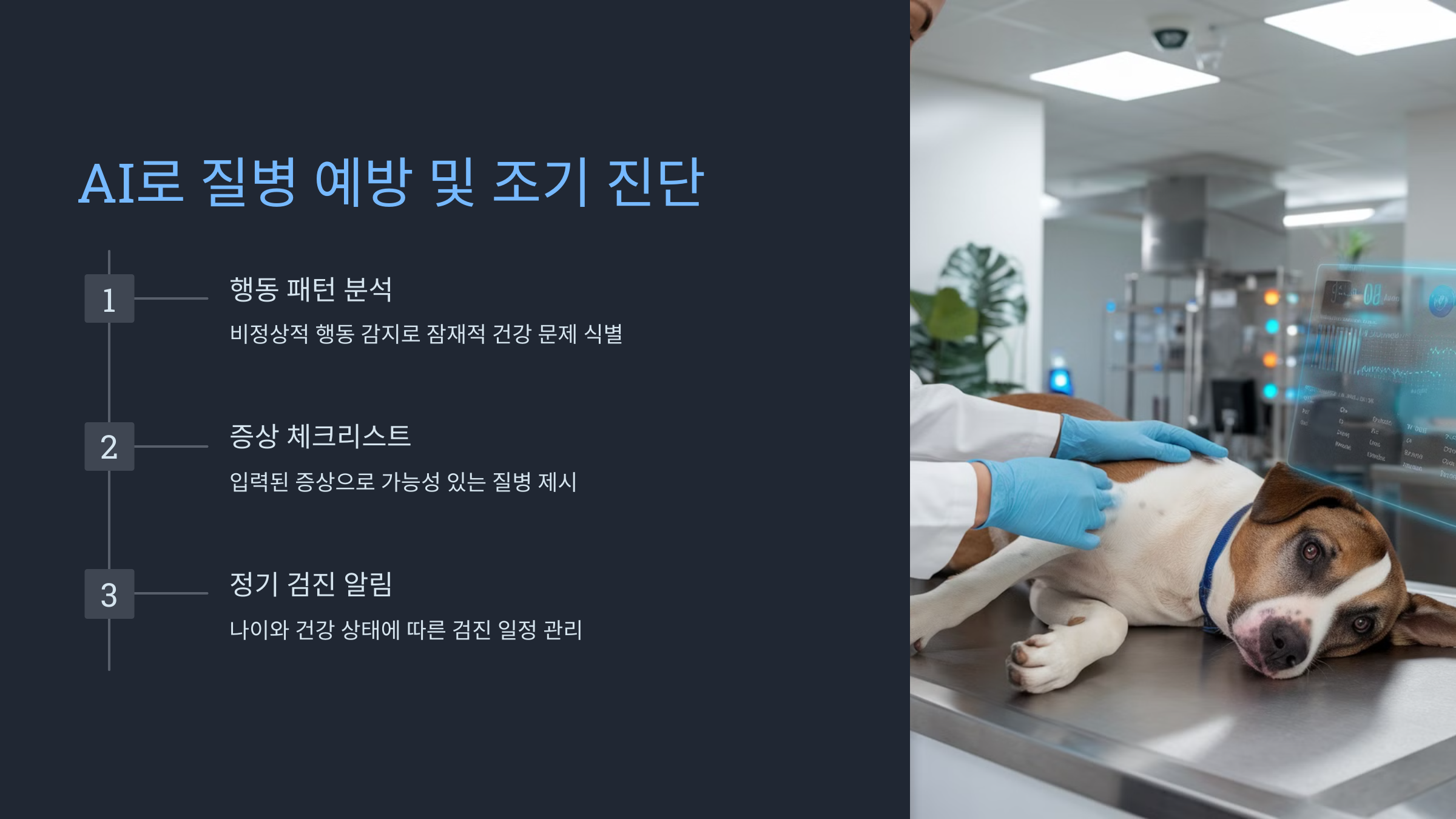 사용자가 관찰한 증상을 입력하면 AI가 가능성 있는 질병을 제시하고, 필요시 수의사 상담을 권유합니다. - 정기 검진 알림